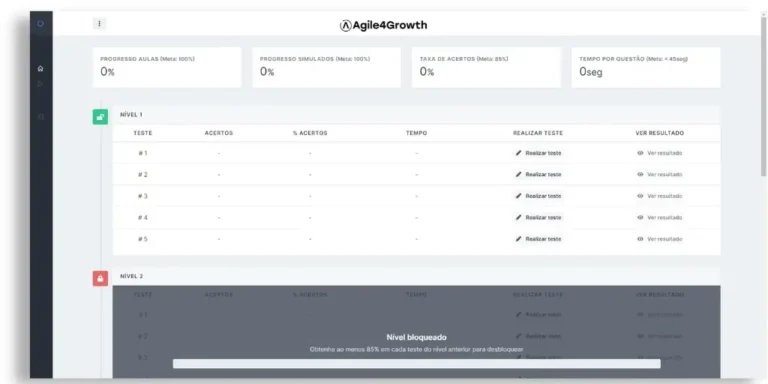 Plataforma Gamificada de Simulados da Agile4Growth com mais de 900 questões similares ao que você irá encontrar na sua certificação
