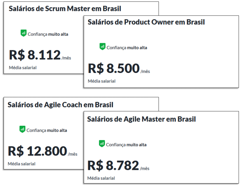 Segundo o site Glassdoor, a média de salários para Scrum Master ou Product Owner no Brasil é de mais de R$ 8.000,00, chegando a mais de R$ 12.000,00 para vagas de Agile Coach.